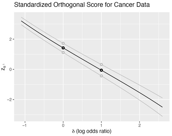 Cancer data—orthogonalized score. Standardized orthogonal score as a function of the log odds difference . The observed data (18 of 23 surgery successes, 11 of 19 irradiation successes) yields the black curve. Two additional sample points shown in gray illustrate the family of 480 possible curves. The nuisance parameter is fixed at . Horizontal lines at intersect the observed curve to yield an approximate 95% confidence interval for .