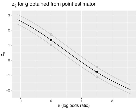 Cancer data—modified MLE estimator. Standardized generalized estimator based on the modified log odds difference , where 0.5 is added to each cell count. The observed data (18 of 23 surgery successes, 11 of 19 irradiation successes) yields the black curve. Two additional sample points are shown in gray. The nuisance parameter is fixed at . Compare with Figure 1 to observe the flatter slope indicating lower -information.