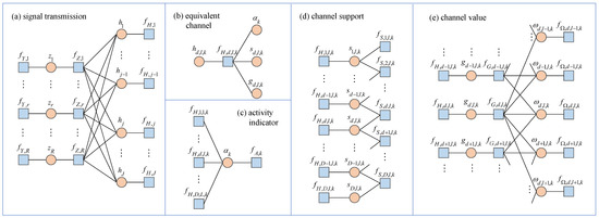 where denotes the cardinality of the set . The factor beliefs and variable beliefs can also be divided into five categories, corresponding to signal transmission, equivalent channels, activity indicators, channel support, and channel values, as listed in Table 2.