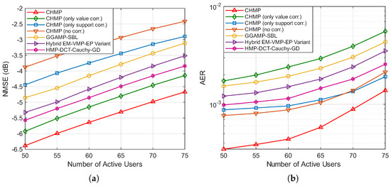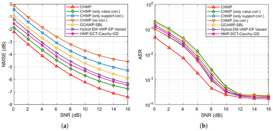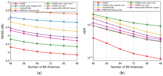 In the NMSE curves, the performance hierarchy remains consistent, with the full CHMP algorithm and the CHMP algorithm with only value correction leading. The HMP-DCT-Cauchy-GD algorithm performs well, showing a better NMSE than the other baselines. However, the performance gap between our proposed CHMP algorithm and all other methods, including HMP-DCT-Cauchy-GD, remains significant and even appears to widen slightly as the number of antennas grows. This trend is particularly revealing. In the AER curves shown in Figure 5b, the proposed CHMP algorithm again shows a significant advantage over all other methods. The HMP-DCT-Cauchy-GD algorithm’s AER is competitive and better than that of the hybrid EM-VMP-EP variant, while being slightly outperformed by CHMP with only support correlation and CHMP without correlation. This again highlights that joint correlation modeling effectively captures the internal structure of channel support and the inherent relationships of channel values. The widening performance gap demonstrates that our angle–delay domain dual-correlation model is exceptionally effective at leveraging the additional spatial information afforded by larger massive MIMO arrays. While HMP-DCT-Cauchy-GD effectively handles frequency-domain structures, our approach’s explicit modeling of the spatial channel characteristics allows it to better capitalize on the increase in antenna elements, leading to more accurate detection and estimation.