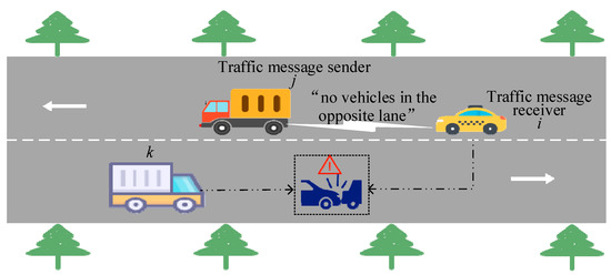 However, the trustworthiness of traffic messages shared within the IoV remains to be evaluation. Due to factors such as self-interest protection, limitations in sensor performance, and heterogeneous observational perspectives [5], the shared traffic message may deviate from actual on-road conditions. If such false message is mistakenly trusted, it can hamper traffic efficiency or even pose risks to the lives and property of passengers and drivers [6]. As illustrated in Figure 1, consider a scenario in which vehicle i intends to overtake by temporarily using the opposite lane, but its own view of the oncoming traffic is obstructed. In this case, the preceding vehicle j may maliciously disseminate false message by claiming that the opposite lane is clear, even though an oncoming vehicle k is approaching. If vehicle i trusts this false message and proceeds to overtake, a collision accident may occur. Therefore, establishing an effective mechanism to evaluate the trustworthiness of shared traffic messages in the IoV constitutes an imperative task.