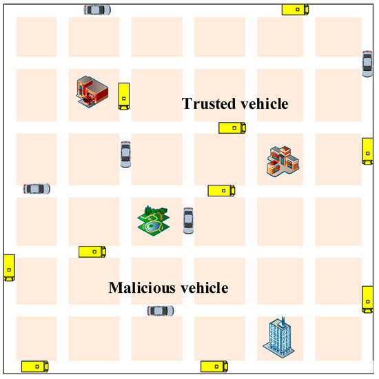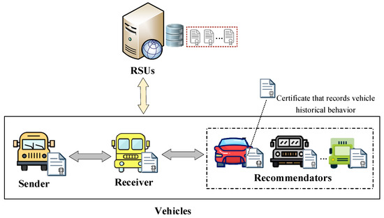 The system model of truth-oriented trust evaluation in vehicular networks is depicted in Figure 2. This model primarily includes two types of entities: vehicles acting as senders or receivers, and Roadside Units (RSUs).