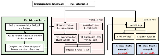 The proposed model serves the purpose of safeguarding connected vehicles against erroneous shared traffic message, thereby ensuring that IoV can effectively improve traffic safety and efficiency. To this end, we present a truth-oriented trust model to evaluate the trustworthiness of shared traffic message. This model includes three parts, i.e., the vehicle trust, the reference degree, and the event trust, as shown in Figure 3.