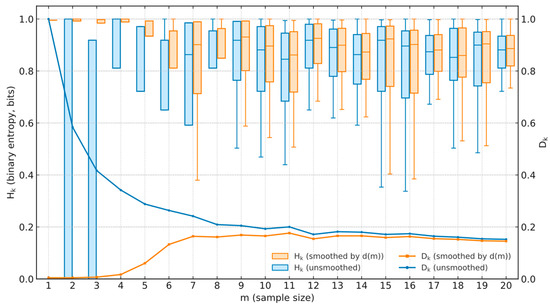 The essential role of d(m) is to regulate the transition between small-sample reliance on the prior A0 and large-sample reliance on the observed ratio s/m, thereby mitigating fluctuations under limited samples and ensuring convergence of trust values as the sample size increases. Meanwhile, Figure 4 contrasts binary entropy Hk (left axis, boxplots) and decisiveness Dk (right axis, curves) for the unsmoothed STij and the STij smoothed by d(m). Without smoothing, small samples exhibit deceptively low entropy with large dispersion (overconfidence). With d(m), entropy is higher at small m (acknowledging uncertainty) and decreases and concentrates as m grows, while Dk increases and stabilizes. These trends align uncertainty with evidence—high at small samples, low at large—thereby providing an information-theoretic validation and explanation for the necessity of d(m) in bridging prior and empirical data.