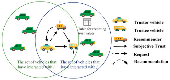 The process for trustor vehicle i to obtain recommendation information about trustee vehicle j is as follows, as depicted in Figure 5. In VANETs, each vehicle maintains a trust table that records the subjective trust values of all vehicles it has interacted with. When vehicle i serves as the road traffic data receiver and vehicle j as the sharer of road traffic data, vehicle i selects neighboring vehicles that have interacted with both i and j as recommenders (e.g., r) based on their respective trust tables. Subsequently, vehicle i sends a recommendation request via multi-hop broadcast to the selected recommenders. Among them, IDi and IDr represent the identity identifiers of vehicles i and r; tir denotes the time at which the request is sent; means the content of the request, that is, r’s recommendation information for j; σi is the signature of vehicle i issuing this request. The recommender who receives the request replies to vehicle i with their recommendation information for vehicle j . The message in response is expressed as follows: .