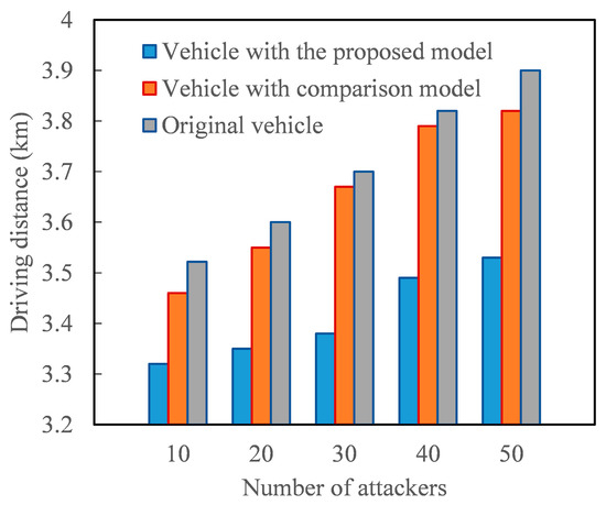 The driving distance of vehicle under different number of attackers.