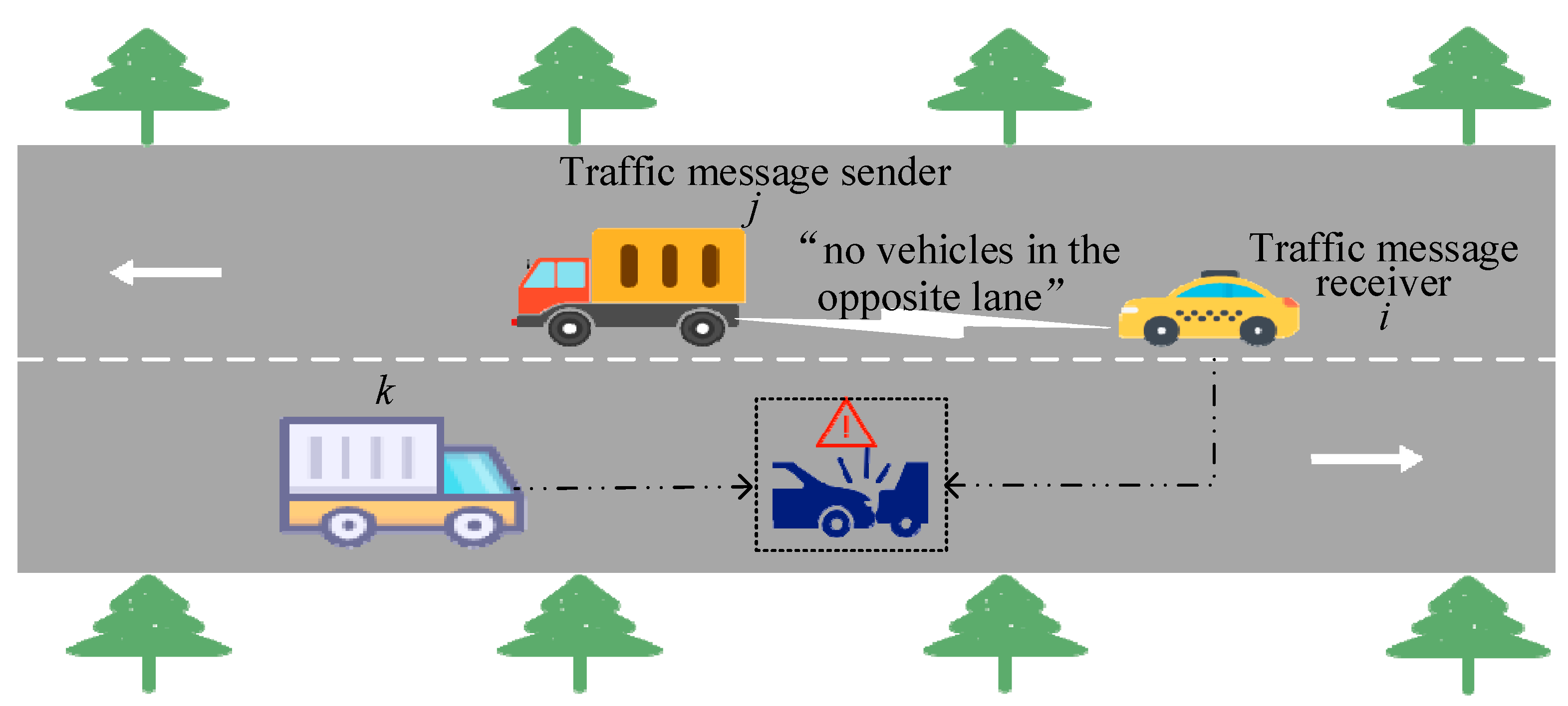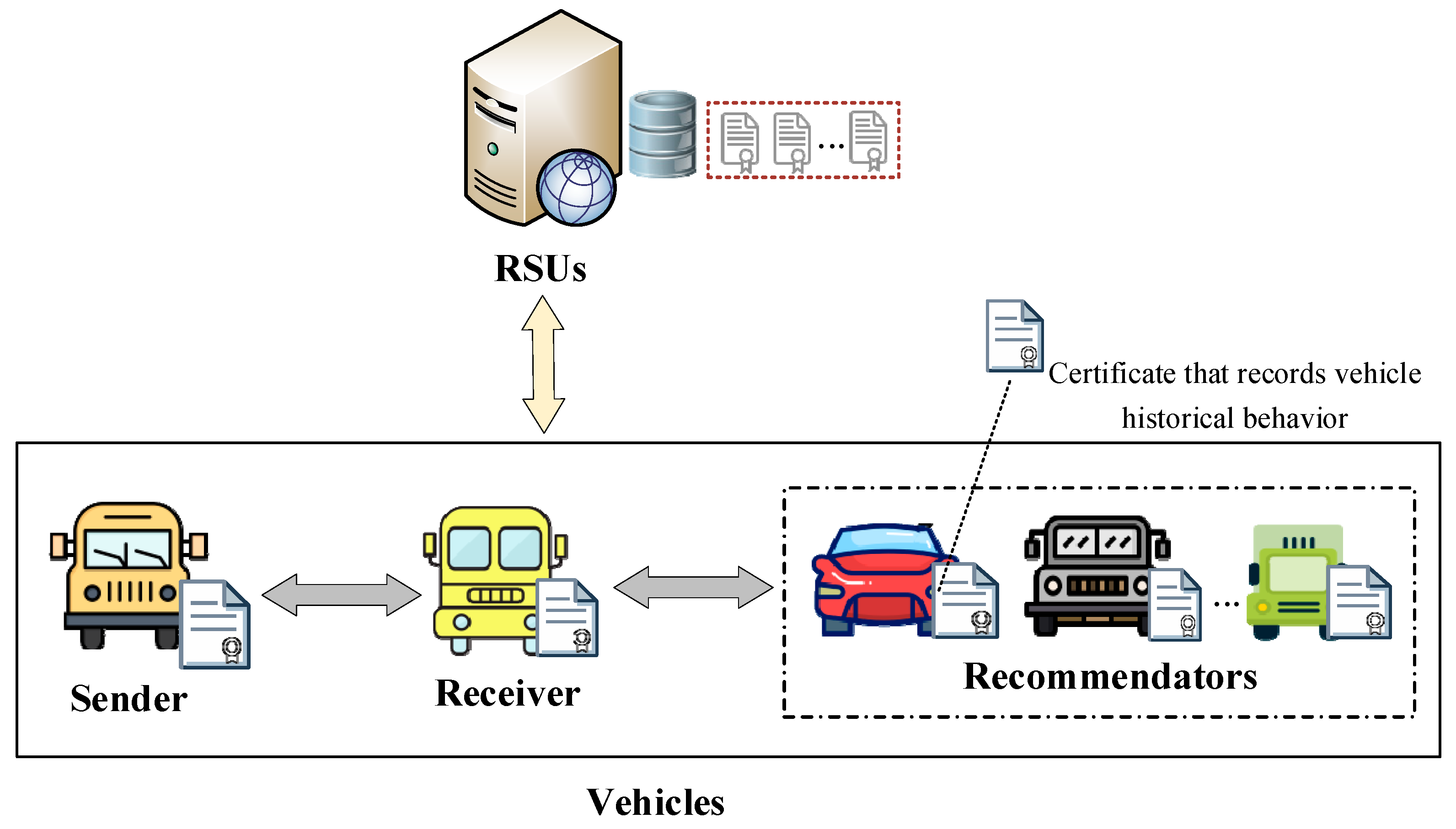 - Vehicles (senders or receivers): Vehicles perceive road conditions through onboard sensors and share the sensed road condition messages with other vehicles via the vehicle-to-vehicle communication standards (e.g., the cellular vehicle-to-vehicle (C-V2V) [18] or dedicated short-range communications (DSRC) [19]). This decentralized message dissemination ensures low latency and local adaptability, both of which are critical for vehicular safety applications. The vehicle receiving the message requests the recommenders’ reference degrees from the RSUs and integrates multi-source evidence to evaluate the message’s trustworthiness, thereby facilitating appropriate actions. After acting on the message, the receiver generate recommendation feedbacks for recommenders based on the trustworthiness and then upload these feedbacks into the RSU. In addition, each vehicle maintains a certificate that records its historical behavior, which contains the identities of the vehicles that have interacted with it and the trust values of these vehicles.