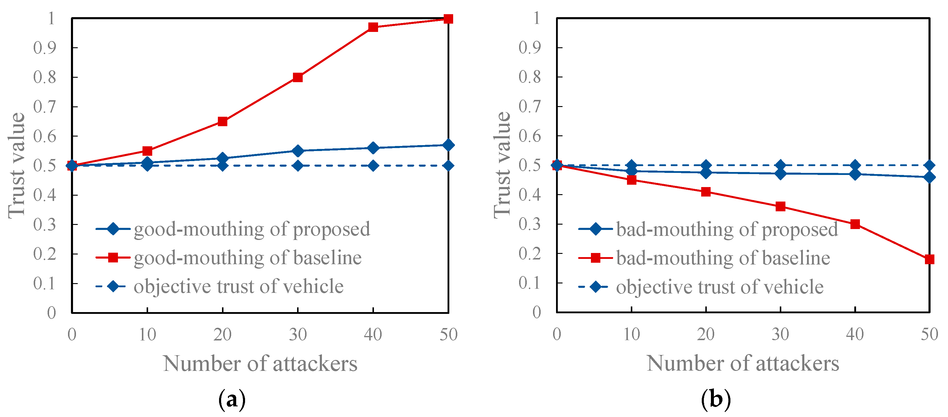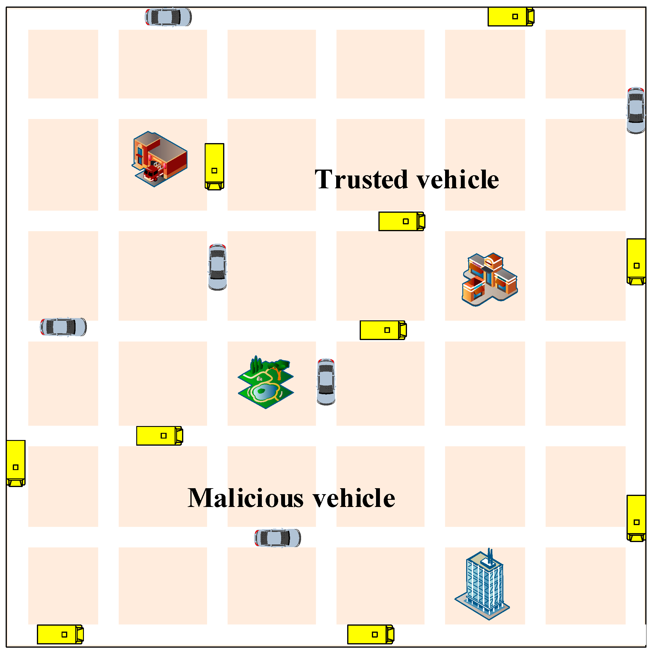- Shaikh, R.; Alzahrani, A.S. Intrusion-aware trust model for vehicular ad hoc networks. Secur. Commu. Netw. 2014, 7, 1652–1669. [Google Scholar] [CrossRef]