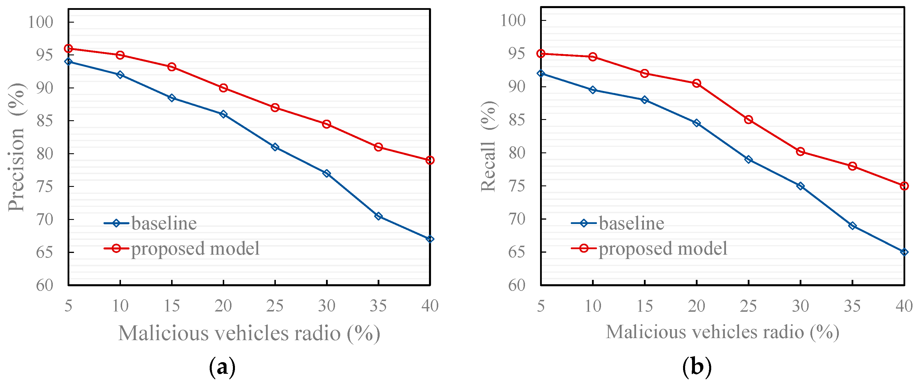 - Recall—It describes the trust model’s detection rate on false traffic message. Then recall can be expressed as: