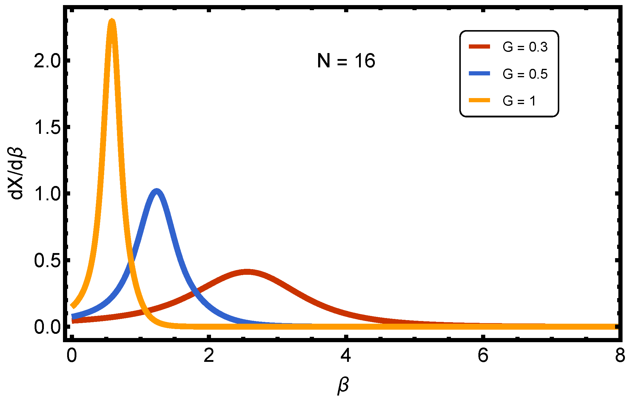 Observed Behavior by Coupling G: (a) Weak Coupling (, red curve): The response is very low; remains close to zero. This means that in the weak-pairing regime, changes in temperature hardly affect the pairing fraction—the system remains essentially unpaired. (b) Intermediate Coupling (, blue curve): A clear peak develops near . This indicates that, at this coupling strength, the system exhibits a pronounced crossover: As temperature is lowered, X rises quickly, and the system reorganizes toward stronger pairings. (c) Strong Coupling (, orange curve): The peak is much sharper and located at lower (higher temperature). This shows that when the pairing is strong, even moderate cooling is enough to lock most fermions into pairs, and the transition to a BEC-like regime happens earlier.
