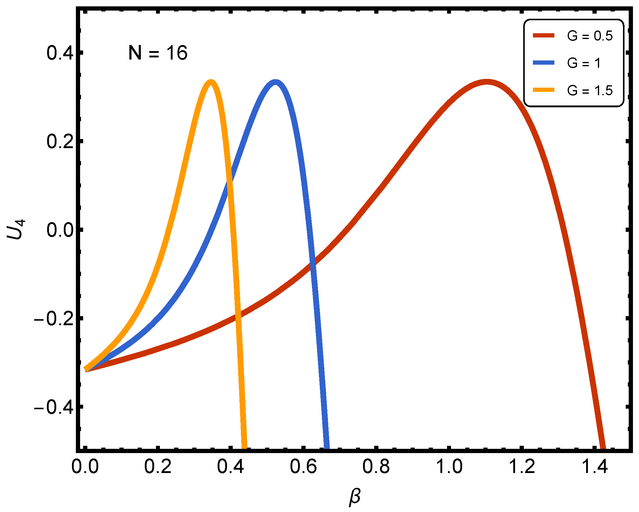 The key physical message of our plots is the following: Increasing G shifts the Binder cumulant peaks to smaller (higher temperature), showing that pairing correlations set in earlier as the interaction strength grows. The positive peaks of highlight strong, non-Gaussian fluctuations characteristic of collective pairing behaviors. The progressively sharper and earlier peaks with growing G are a clear finite-size signature of the BCS-BEC crossover physics: from smooth Gaussian-like fluctuations at weak coupling to sharply ordered, non-Gaussian ones at strong coupling.