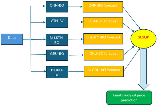 Our proposed mode for crude oil price prediction is based on an ensemble of deep learning systems where each single deep learning is used to generate a forecast in the first stage. Then, in the second stage, the sequential least squares programming (SLSQP) [30] algorithm is adopted to calculate the final prediction. The latter is calculated by SLSQP as the weighted value from all forecasts generated by deep learning systems. Specifically, in this stage, the SLSQP algorithm is used to minimize the mean squared error between the actual values and the weighted sum of the ensemble model predictions. The algorithm adjusts the weights of CNN, LSTM, BiLSTM, GRU, BiGRU, and DFFNN, with the constraint that the weights add up to 1. SLSQP is an iterative method for constrained non-linear optimization with significant potential to be more stable than the sequential quadratic programming algorithm under numerical noise [31]. Figure 1 shows the flowchart of our proposed deep learning-based ensemble model, where BO is used to fine-tune parameters of deep learning systems and SLSQP is adopted for final forecast aggregation. It is expected that our ensemble model based on deep learning systems could benefit from their respective advantages to generate accurate predictions.