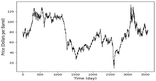 This study implements and proposes an ensemble deep learning models to predict spot prices in two major crude oil markets: Brent and WTI. The datasets span from 4 January 2010, to 12 February 2024, and feature daily observations. The datasets were obtained from the U.S. Energy Information Administration (EIA) [34], all in USD. Collecting over a decade of data enhances the deep learning models used in this research by providing a broad spectrum of market conditions, which helps detect complex patterns and improve forecasts’ accuracy. This extensive data collection enables the models to effectively generalize and predict future market behaviors, which is crucial for achieving robust performance in the volatile markets of oil. Figure 2 and Figure 3, respectively, display Brent and WTI spot prices. In this study, a normalization procedure is applied to scale the data between 0 and 1, ensuring consistency in data scales and facilitating efficient model training. The dataset is split into 80% for training (4 January 2010, to 9 September 2019) and the remaining 20% (from 10 September 2019, to 12 February 2024) for testing, allowing for robust training and performance evaluation on unseen data. A 30-day historical window is used to forecast one day ahead, capturing essential trends in Brent and WTI crude oil markets. Each training instance uses a 30-day sequence to predict the next day’s value, enhancing the model’s ability to learn from recent behaviors. This method aligns with standard financial and commodity market analysis practices and ensures reliable prediction performance. The hyperparameters setting is shown in Table 1.