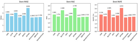 Bar plots of performance metrics across all models post-BO for the Brent crude oil market. Under Bayesian optimization, the proposed weighted ensemble system (W-Ensemble) reached the lowest RMSE, MAE, and MAPE. The DFFNN system obtained the highest RMSE, MAE, and MAPE.