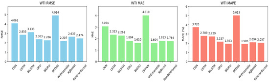 Bar plots of performance metrics across all models post-BO for the WTI crude oil market. Under Bayesian optimization, the proposed weighted ensemble system (W-Ensemble) reached the lowest RMSE, MAE, and MAPE. The DFFNN system obtained the highest RMSE, MAE, and MAPE.