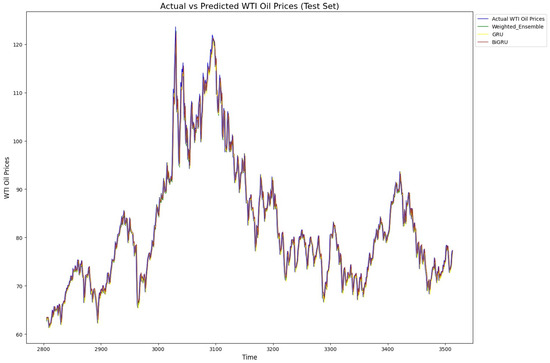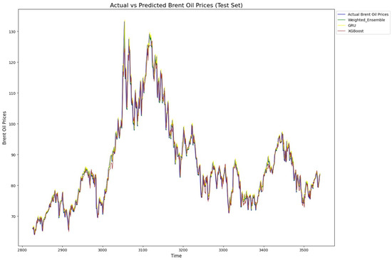 This study tackles the challenge of forecasting prices in the highly volatile oil markets, which play a crucial role in the global economy. Price fluctuations in these markets have significant impacts on national economies, energy policies, and investment decisions. Our proposed model developed in this research aims to enhance forecasting accuracy, offering valuable insights for risk management and informed decision-making as this topic is receiving growing attention in the literature [35,36]. For both Brent and WTI markets, our proposed weighted ensemble model emerged as the top performer. This model excels in capturing both short- and long-term patterns in the data and effectively managing the volatility inherent in crude oil prices. As a result, our proposed model is a strong option for decision-makers looking to minimize forecasting errors in this sector.