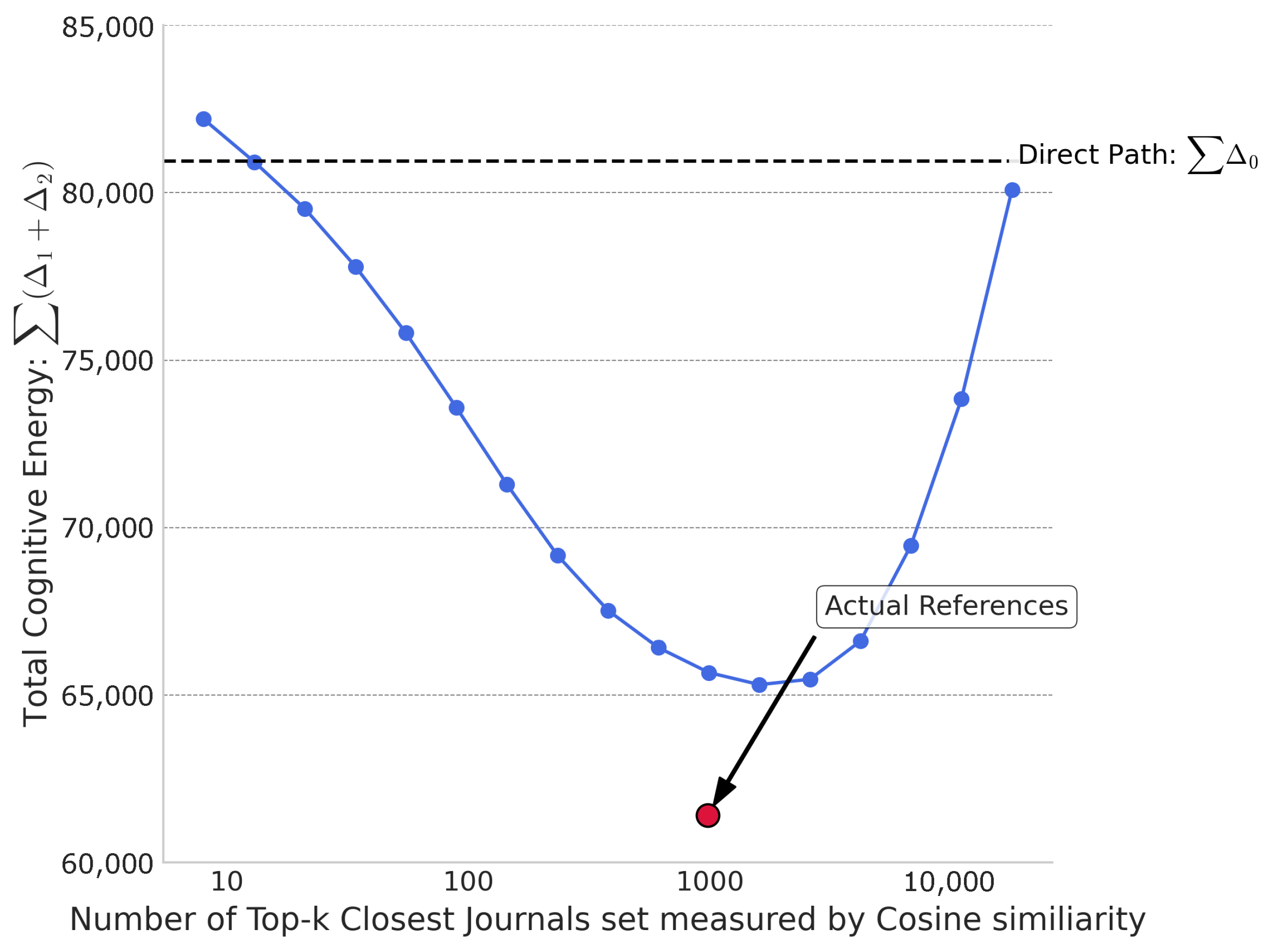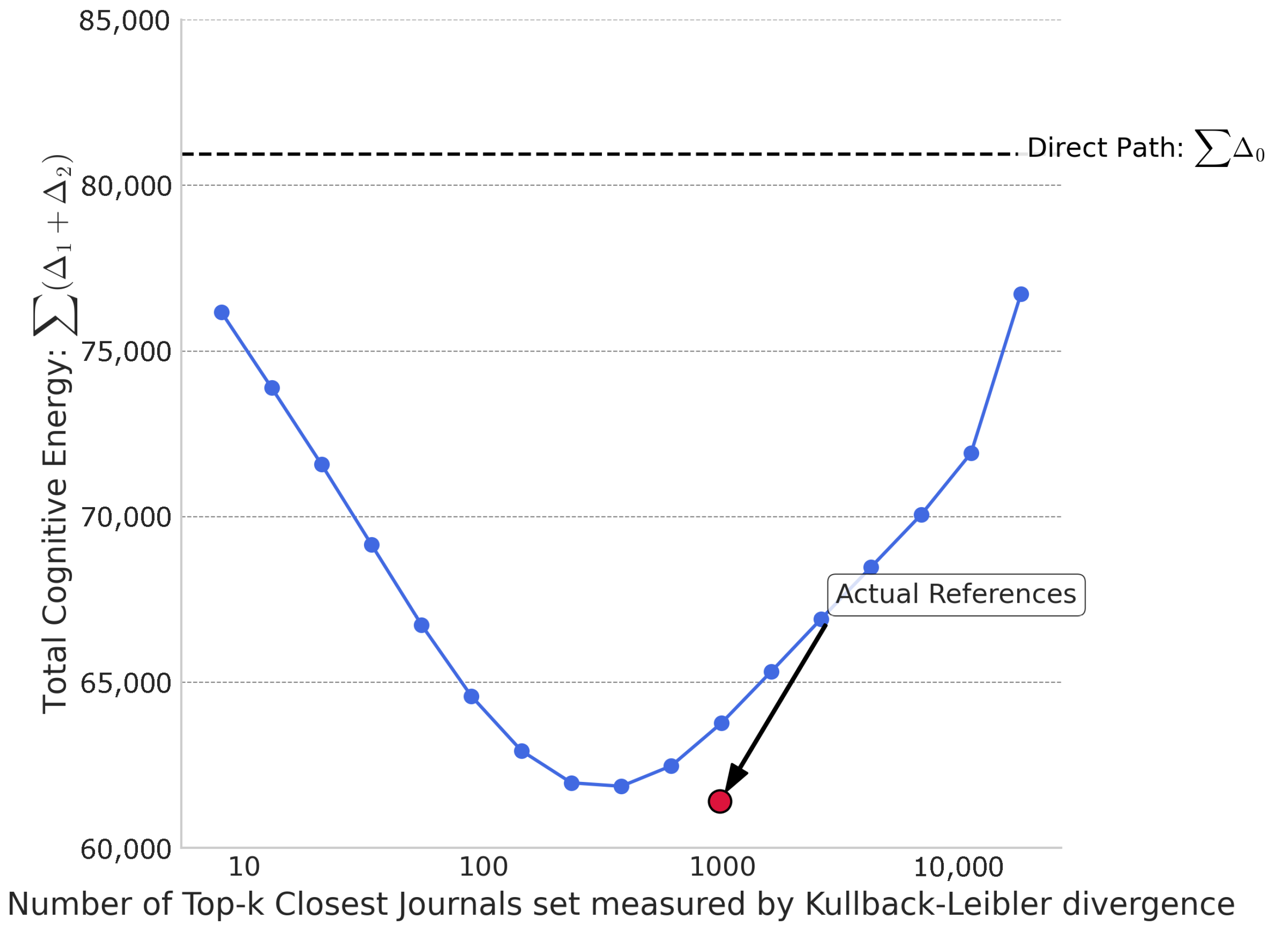 -divergence-closest journals as intermediaries is, indeed, more efficient than the direct path. Most importantly, the red dot marks the cognitive energy of the actual reference portfolios at the median size of real-world reference lists (