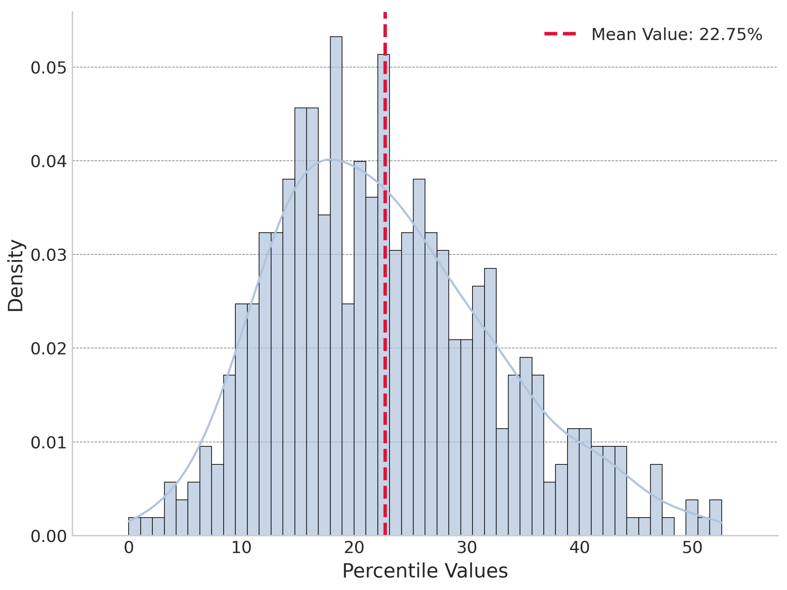 To formally address the need for greater statistical rigor and to test the universality of this principle beyond top-tier journals, we conducted a new, more extensive analysis on a random sample of 500 journals drawn from the entire dataset of 19,129. For this random sample, we calculated effect sizes (Cohen’s d) and bootstrapped 95% confidence intervals (CIs) from 10,000 resamples to support our findings. The results from this broader sample provide powerful statistical validation for the global optimization principle. The mean percentile rank of the real portfolio () within its 1000 randomly assembled alternatives was 1.34% (95% CI: [0.80%, 1.97%]). This confirms that actual reference portfolios are consistently found at the extreme low end of the cognitive energy distribution in global perturbation test. The effect size for this comparison was exceptionally large, with a mean Cohen’s d of 3.93 (95% CI: [3.79, 4.07]). The local perturbation experiment, which reflects a robust “satisficing” strategy, yielded similarly strong results on the random sample. The mean percentile rank of the real portfolio among its 1000 locally perturbed variations was 19.41% (95% CI: [18.59%, 20.24%]), demonstrating that under local perturbation test the actual portfolio is superior to the vast majority of slightly altered combinations. The corresponding effect size was a large Cohen’s d of 0.78 (95% CI: [0.76, 0.81]).