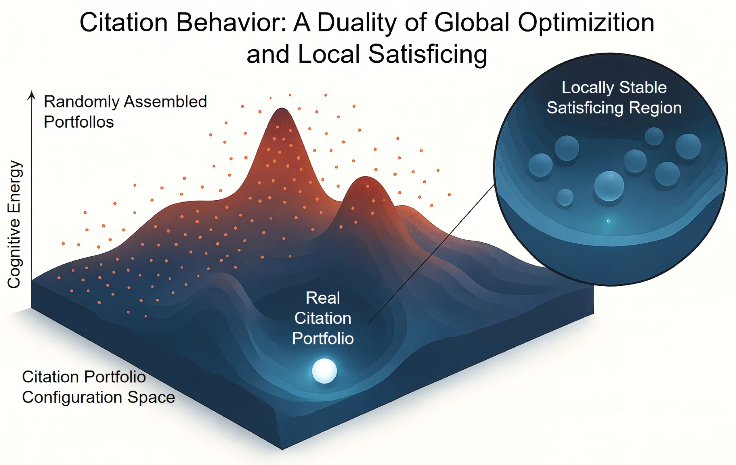 The global resampling experiment shows that, on a macro scale, a journal’s real citation portfolio is a highly optimized whole, whose synergistic effect far exceeds the simple sum of relevant literature. However, the local replacement experiment further reveals that this optimization is not without constraints in the real world. Although the real citation portfolio shows strong local stability and robustness, a small number of combinations with lower energy may theoretically exist. This suggests that the final citation choice is a result of a compromise between the theoretical drive for “minimum energy” and real-world constraints like path dependence and discovery costs, reflecting a pursuit of a “satisficing” rather than an absolute “optimal” solution in scientific practice. We draw a diagram to visually represent this duality as