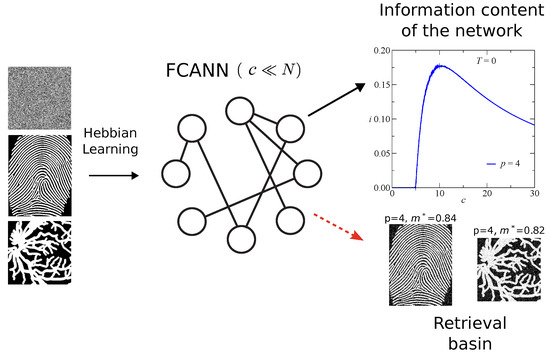 Figure 1 presents a schematic overview of the Finite Connectivity Attractor Neural Network (FCANN) framework employed in this work. The network is represented as a set of neurons connected through an Erdös–Rényi topology with finite average connectivity , emphasizing the sparse nature of the architecture compared to fully connected models. Patterns are embedded into the synaptic couplings following the Hebbian learning rule, with two distinct types of stored inputs: (i) random binary patterns, used for theoretical analysis and numerical simulations, and (ii) biometric patterns, specifically fingerprint images and retinal vessel maps, used to evaluate retrieval performance on real data. The diagram also illustrates the retrieval phase, in which the network reconstructs an original pattern from a noisy or partially degraded version, allowing the evaluation of the retrieval overlap m and the information content i. The retrieval basin of the system is illustrated in the figure for and , serving as a representative example of retrieval performance for a specific pattern load, and linking the conceptual schematic to the quantitative results presented in later sections.