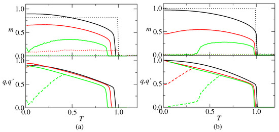 Retrieval overlap m, spin-glass parameter q (solid lines) and overlap between replicas (dashed lines) versus temperature T. (a) , (black), (red) and (green); (b) , (black), (red) and (green). The RS solution becomes unstable at , pointed out by the bifurcation between q and . Dotted lines in the upper graphics represent simulation results for a network with neurons. In the lower graphics, the dashed lines represent the .