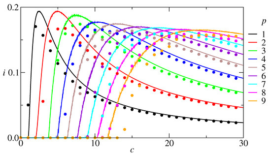 Since neural networks deal with information storage and retrieval, it is useful to investigate the relationship between the amount of information, the average connectivity, and the number of stored patterns. From a practical point of view, what is most promising: to built one dense network with a large c to store a large p or several less dense networks with a small c to store a small p in each one? A tentative answer is addressed in Figure 4, with the information content plotted as a function of the connectivity for p varying from 1 to 9, at zero temperature. The results show that i is a non-monotonic function of c and, consequently, for each p there is a c that maximizes i. The absolute maximum is , obtained for both and and then slowly decreases for larger p. Curves for the information content versus connectivity were also evaluated through numerical simulations on a network with 100,000 units. The result, shown in Figure 4, shows a good agreement with the RS results, except that the theoretical results overestimate the simulation ones. We could enumerate five reasons for deviations from theoretical to simulations: (1) finite N, error around ; (2) discrete c in simulations versus continuous c in theory; (3) correlations between patterns for small c; (4) numerical errors in the evaluation of ; and (5) RS hypothesis. All these errors combined can explain the discrepancies in Figure 2 and why the dots in Figure 4 are under the continuous curves.