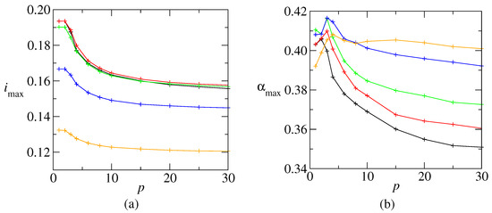 (a) Maximum information content as a function of p, at (black), (red) (green), (blue) and (orange). (b) The corresponding , where is the connectivity value that maximizes the information content, for each p value. The same color scheme as in (a). The lines are only to guide the eyes.
