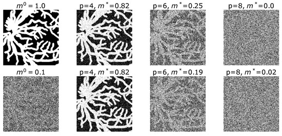 The simulation results presented so far refer to random input patterns. We may ask whether the theoretical predictions also hold for real-world visual data. To explore this, we employed binarized digital retina patterns derived from the DRIVE dataset [28], which contains high-resolution fundus images of human retinas. Each image was cropped to remove peripheral borders lacking structural information and then binarized to represent the main vascular structures as black–white patterns. The resulting images have a resolution of pixels, corresponding to a total of 99,856 binary units per pattern.