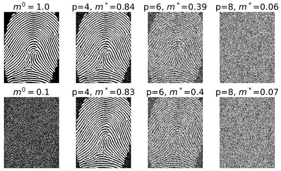 The results, shown in Figure 7, exhibit the same qualitative behavior observed with the retinal patterns: the fixed-point overlap decreases as the number of stored patterns p increases, while remaining relatively robust to variations in the initial noise level. These findings confirm that the FCANN model can successfully retrieve complex biometric patterns beyond retinal structures, further supporting the generality and robustness of the theoretical predictions when applied to structured, real-world data.
