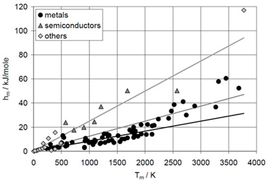 Alefeld [8,9] collected some of them. Well known is Richard’s rule (≈1880), which states that for metals X = 1 to 1.5. As Figure 1 shows, the rule describes many but not all metals. For semiconductors, X = 3 is stated. Again, Figure 1 shows that it describes many but not all. Comparing the general form of the rules, Equation (6), with the applicable form of Equation (3), which is