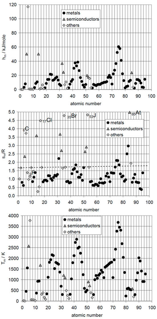 Top down: molar melting enthalpy hm, molar melting entropy sm, and melting temperature Tm of the elements versus atomic number AN = 1 to 95 (source: Mehling and Günther [7]).