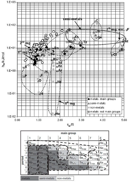 Molar melting enthalpy hm versus entropy sm divided by R for the elements with atomic number AN = 1 to 95; the identified elements with similar behavior are marked below in the PSE (source: Mehling [11]).