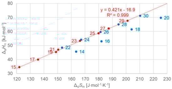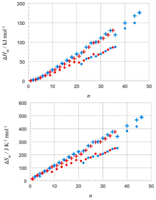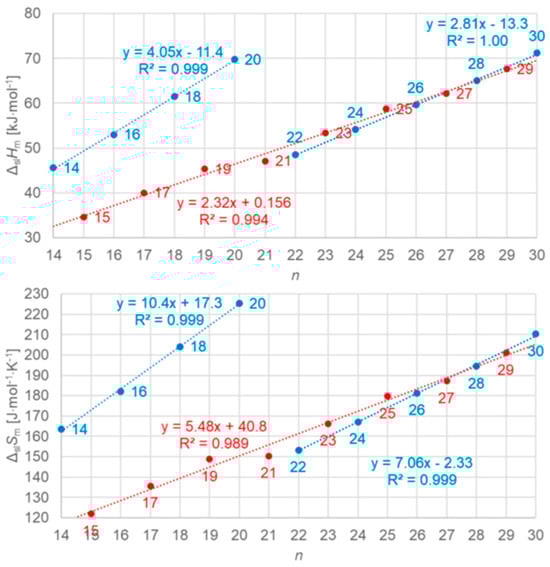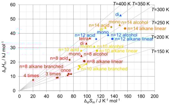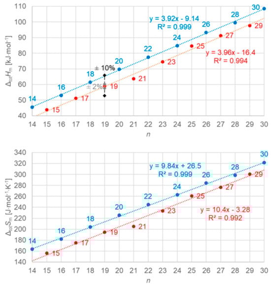 The correlation of ΔpcHm with ΔpcSm has been apparently only investigated by very few researchers. For the solid–liquid phase change, ΔslHm versus ΔslSm, Soodoo et al. [17] plotted not only values of alkanes, even and odd n, but also of fatty acids, fatty alcohols, mono- and diesters, and others in a single plot. It shows a linear correlation for all, most close together, except for diamides. Dall’Acqua and Della Gatta [16] plotted values of alkanes and alkane-α,ω-diamines, odd and even n separate for each, in a single plot. It shows an almost perfect linear correlation for all, with the fitted lines being parallel. Mehling and White [18] investigated besides alkanes also alcohols and fatty acids. Figure 10 shows, among other things, the data points for n = 8, 10, 12, and 14. Again, there is an almost perfect linear correlation for the data of the alkanes, the alcohols, and the fatty acids, and the lines are parallel. Additionally, for each individual n the data points of the alkane, alcohol, and fatty acid, differ by a similar shift.