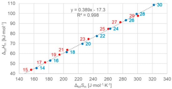 Molar solid–liquid phase change enthalpy versus entropy of alkanes, with blue for even and red for odd n (source: Mehling and White [18]).