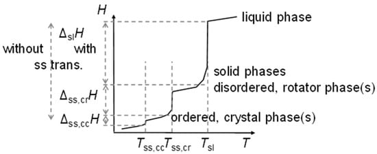 In older literature, rules like Richard’s rule can be found which essentially assume a proportionality between ΔpcHm and Tpc, thus due to Equation (3) a typical ΔpcSm. R&D in the past decade using plots of ΔpcHm versus ΔpcSm showed, however, that there is instead a wide variety of material class typical enthalpy–entropy correlations. Individual correlations were identified for the elements (metals of main groups, metals not of main groups, halogens, noble gases, etc.), compounds in general, and for the homologous series of the n-alkanes and others, regarding solid–liquid as well as solid–solid transitions. In the latter case, to see the details, calorimetric data with sufficient resolution and accuracy were required. Further on, for a complete picture, looking at the different types of transitions, solid–liquid as well as solid–solid, and separate analysis as well as analysis of total values was necessary. This is probably needed for all homologous series.