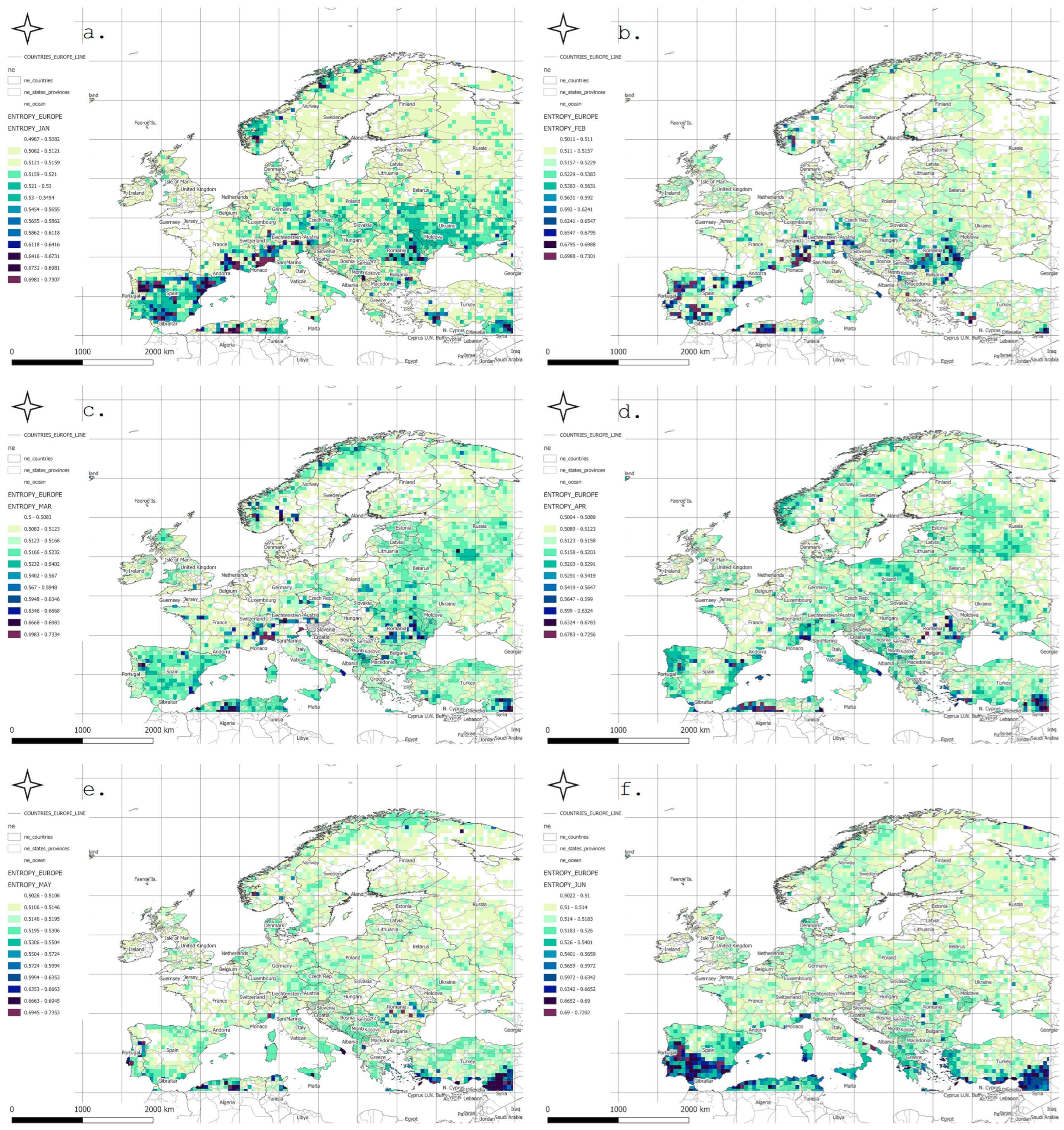 The highest entropy values, indicating the greatest uncertainty in weather regimes, were observed in the Mediterranean basin and the southern Balkans, suggesting significant seasonal instability in these regions. In contrast, Northern and Central Europe exhibited low , values, which implies a greater predictability of climatic patterns, potentially linked to the dominance of stable barometric systems.
