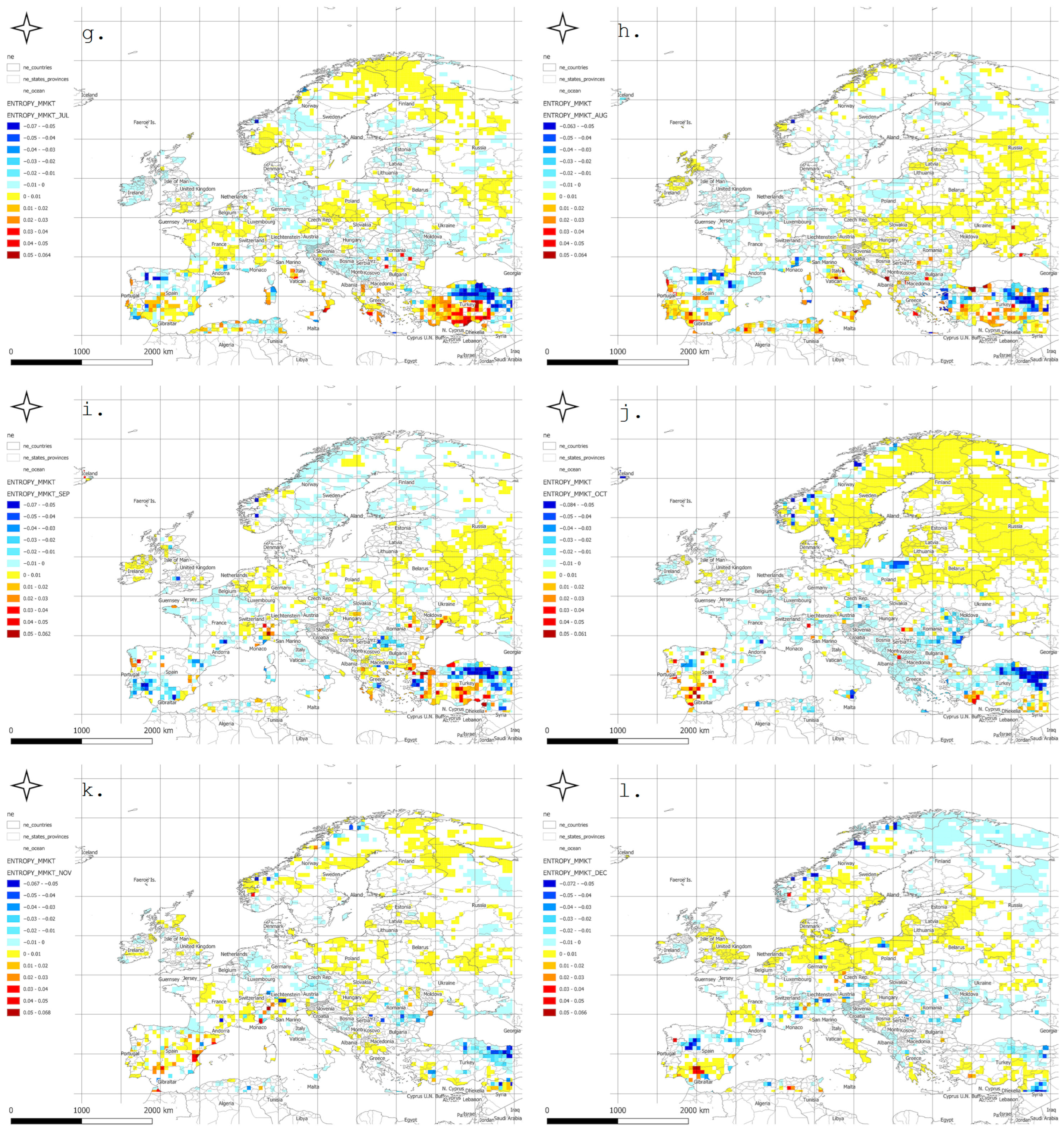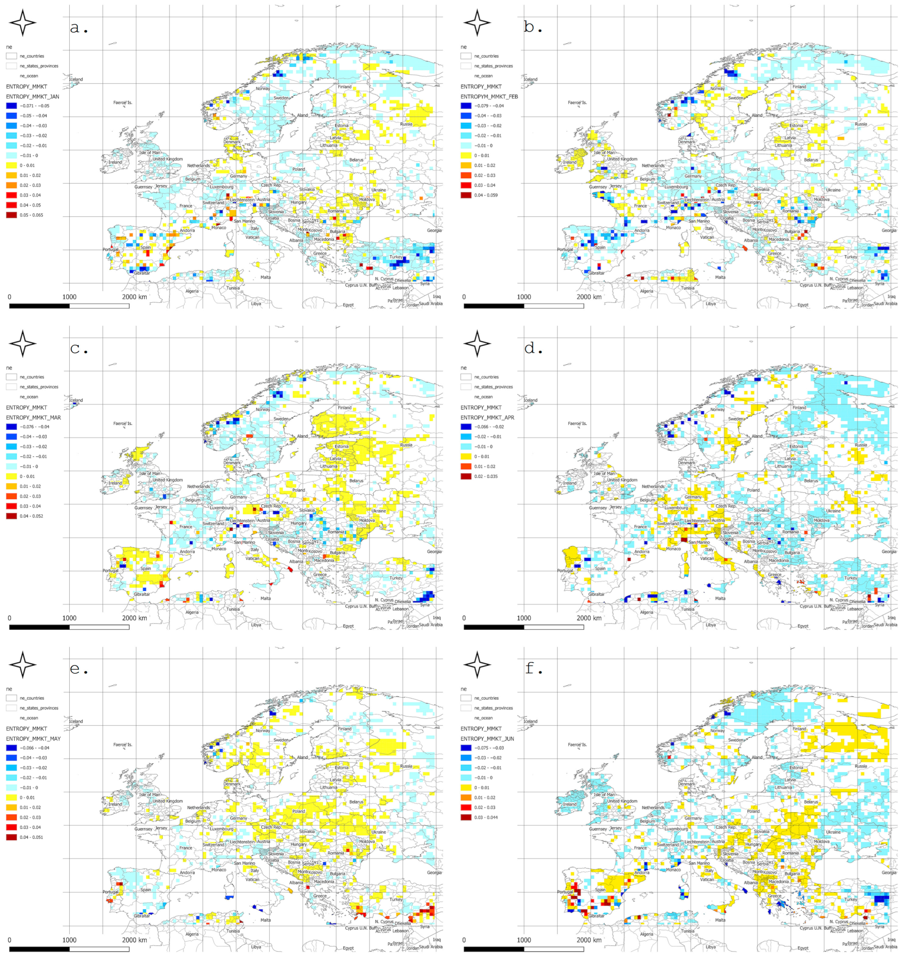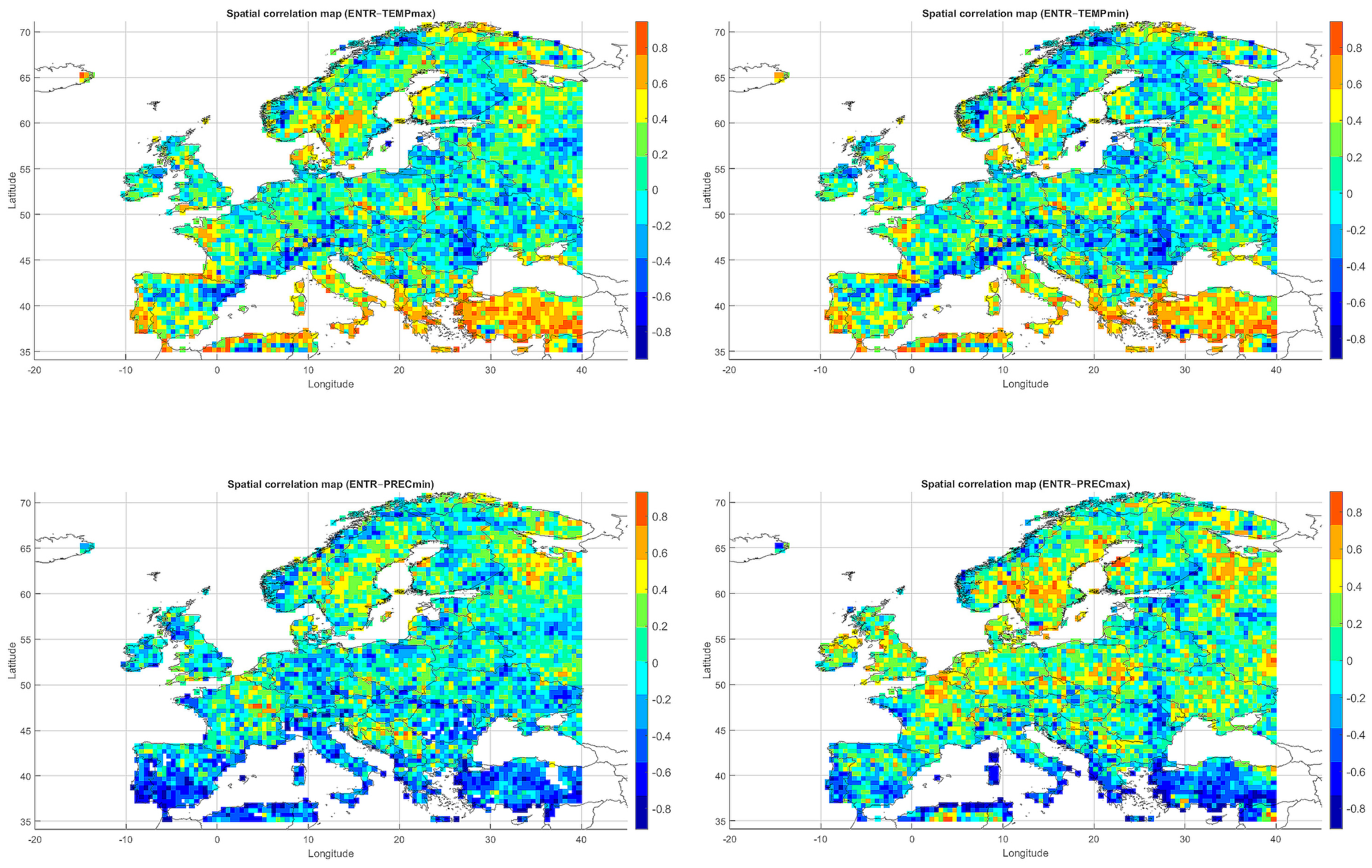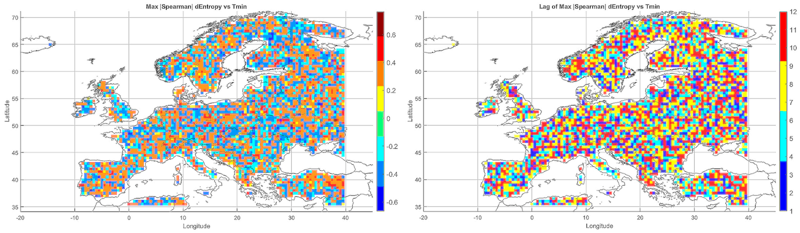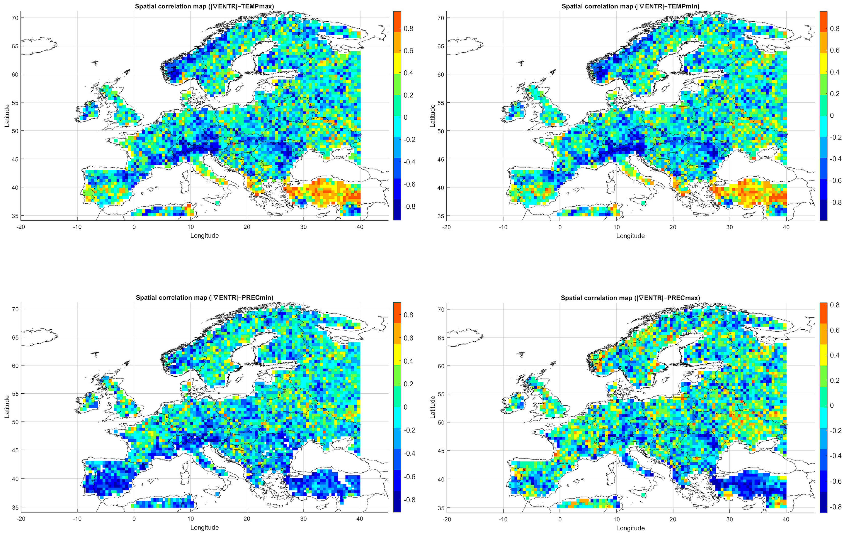 Both entropy and its spatial gradient proved to be effective indicators of thermal and hydrological risk. In particular, the entropy gradient () enabled the detection of spatial weather contrasts and may serve as an early indicator of drought, especially in southern Europe. The relationships between the entropy gradient and meteorological variables were particularly strong for maximum temperature and precipitation in climatically dynamic regions such as the Balkans, Scandinavia, and Central Europe, while correlations with minimum variables were more heterogeneous, reflecting the influence of local factors.