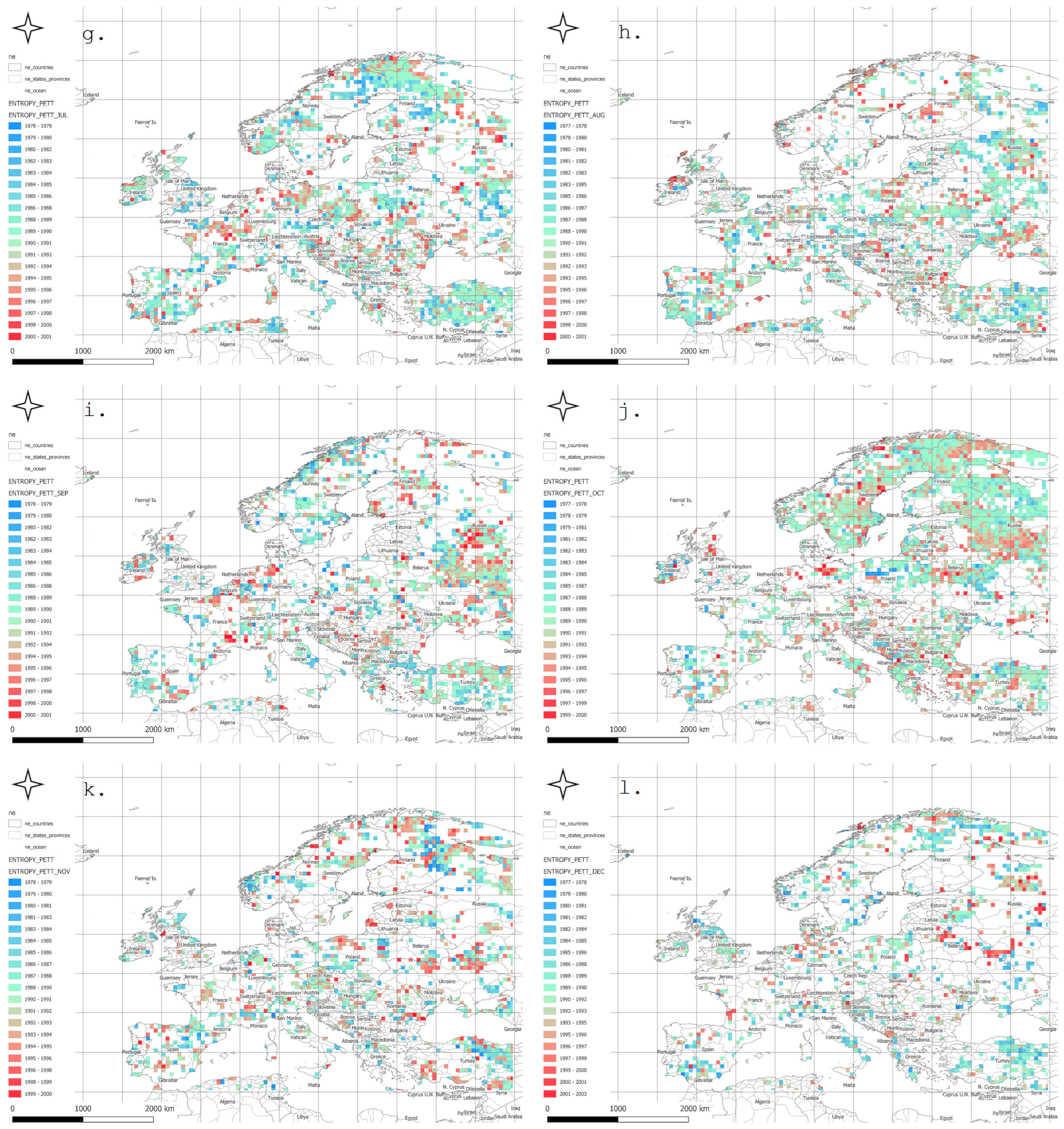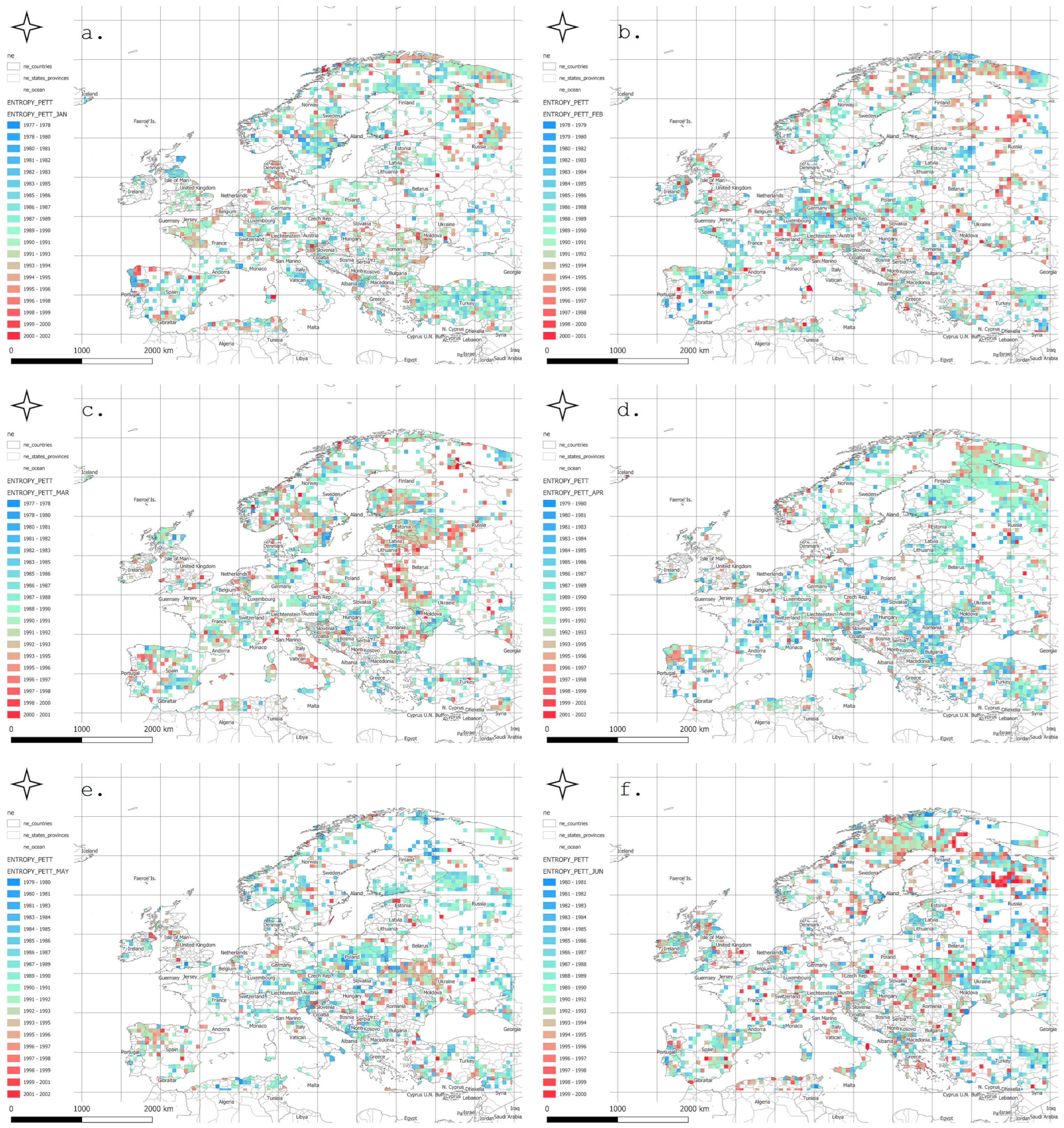 This approach is based on the analysis of annual values of entropy and their spatial gradients (entropy potential) for individual months, calculated at grid points covering the European domain. For each grid point, monthly values of information entropy were computed based on the joint distributions of atmospheric conditions—temperature and precipitation.