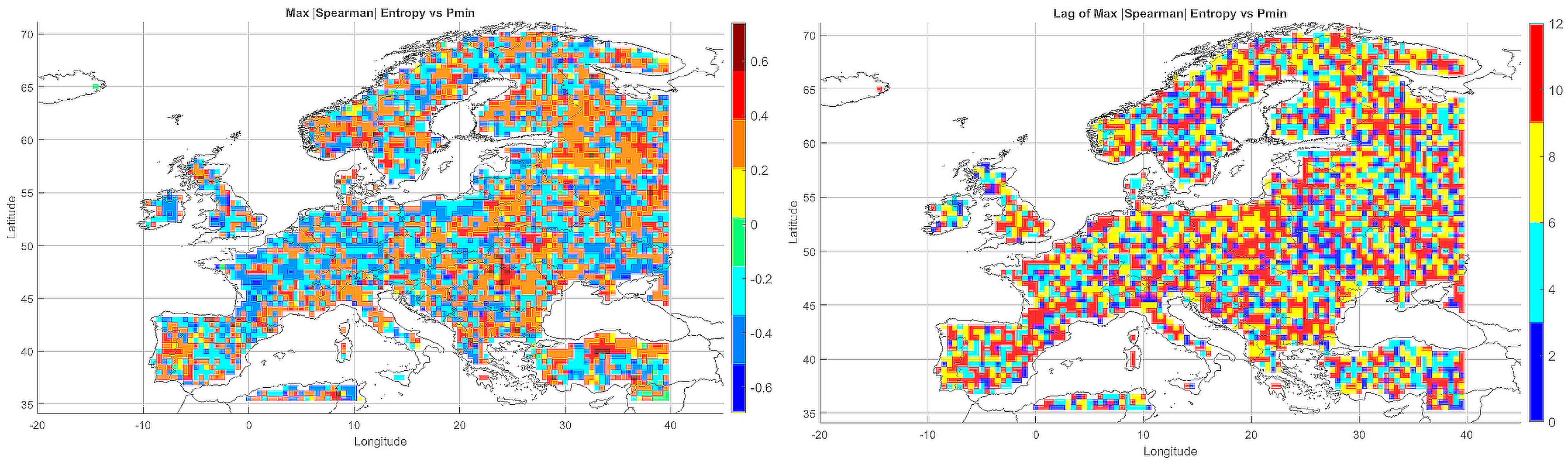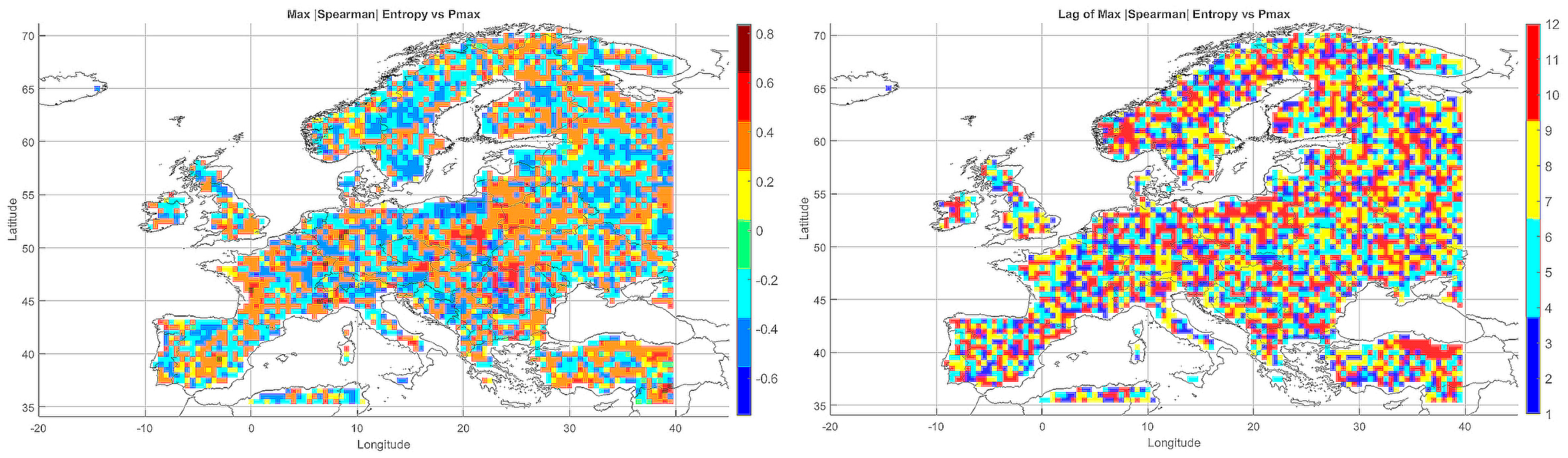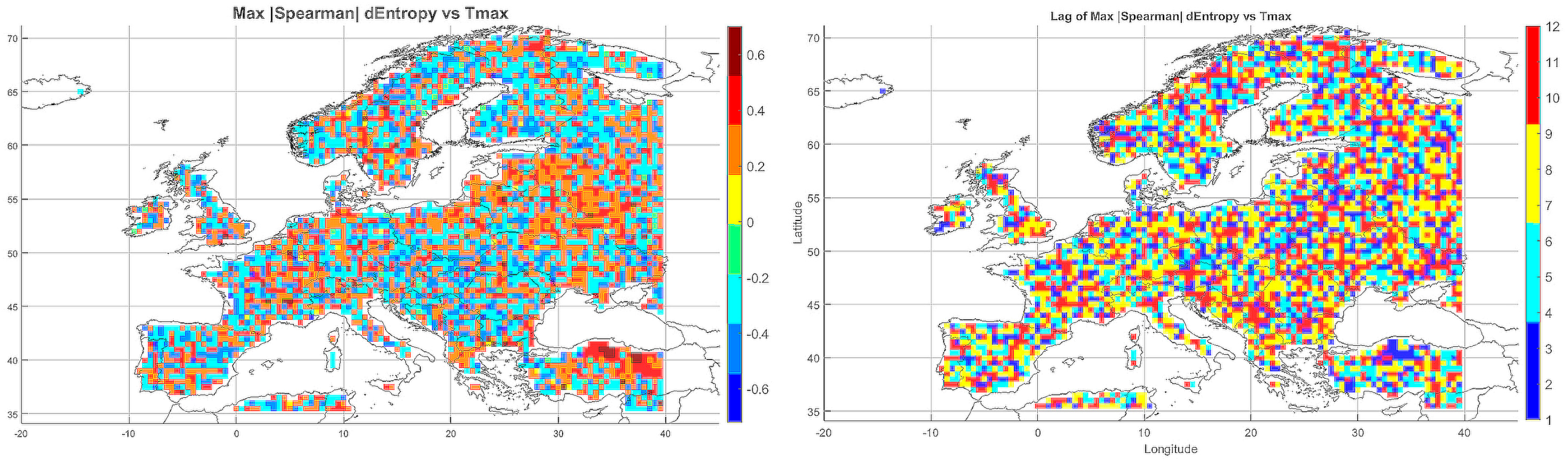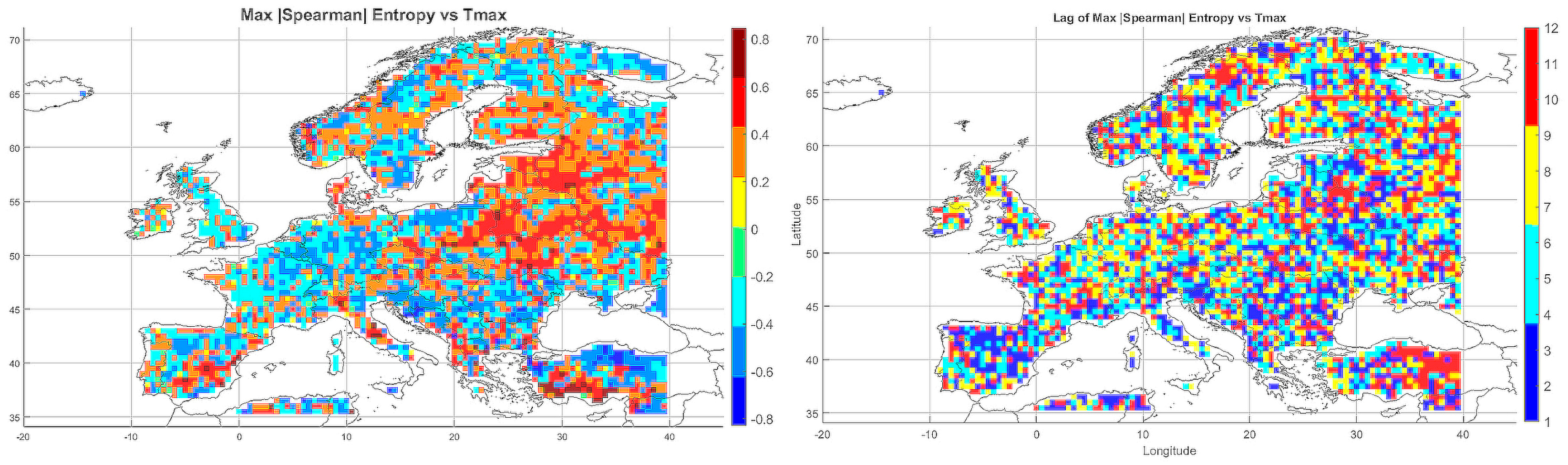 Table 3 presents a comparative overview of the spatially distributed, maximum temporal Spearman correlations between measures of entropy (