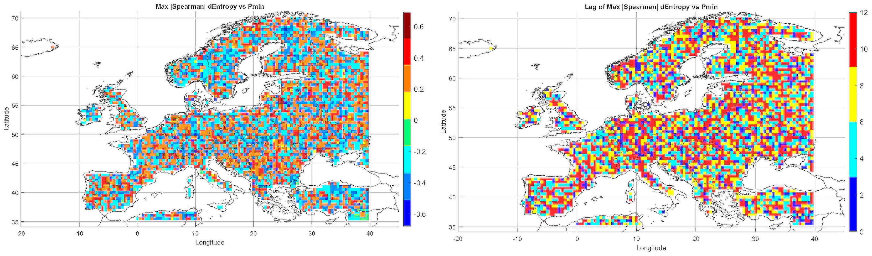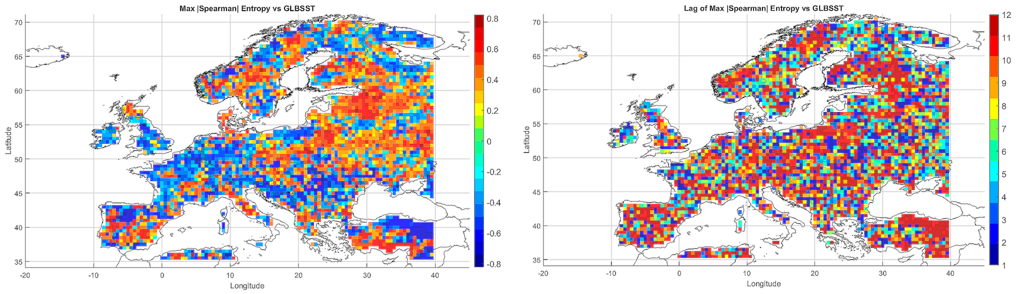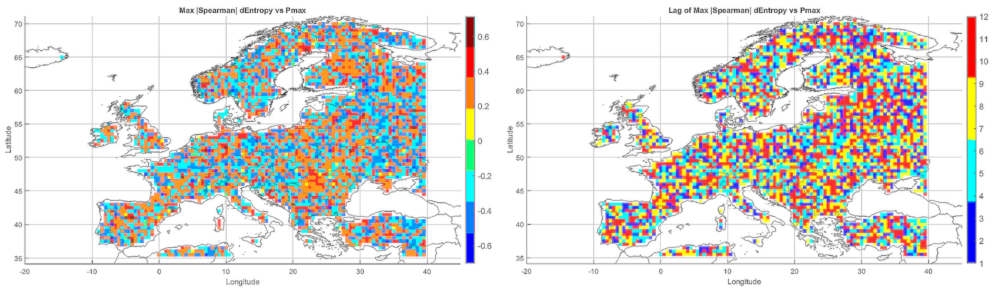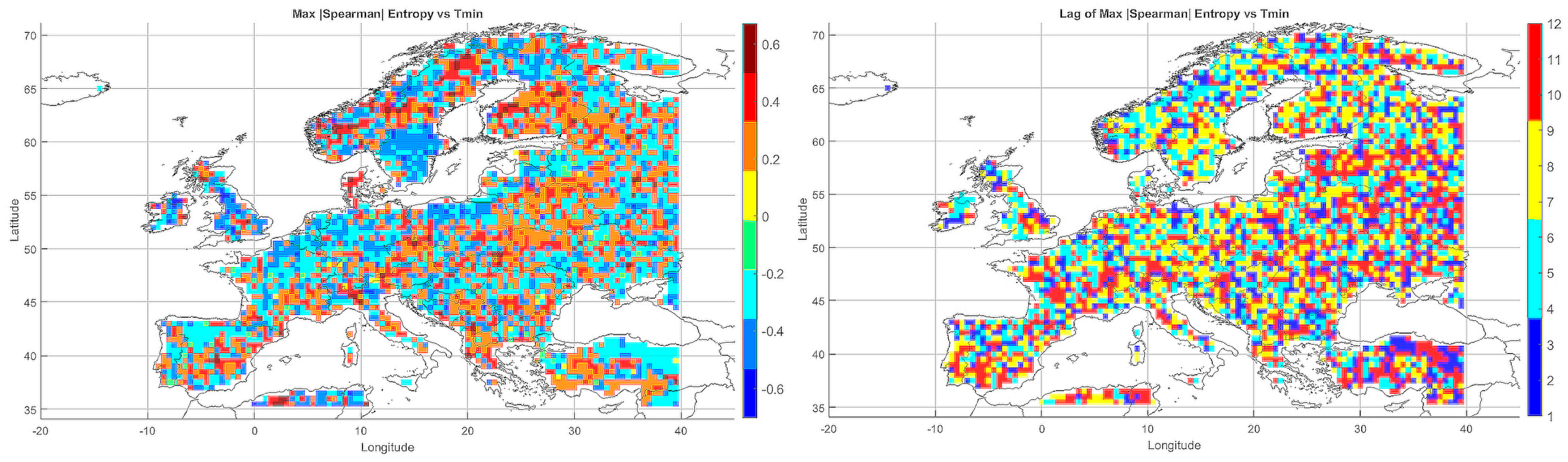 Table 3 presents a comparative overview of the spatially distributed, maximum temporal Spearman correlations between measures of entropy (