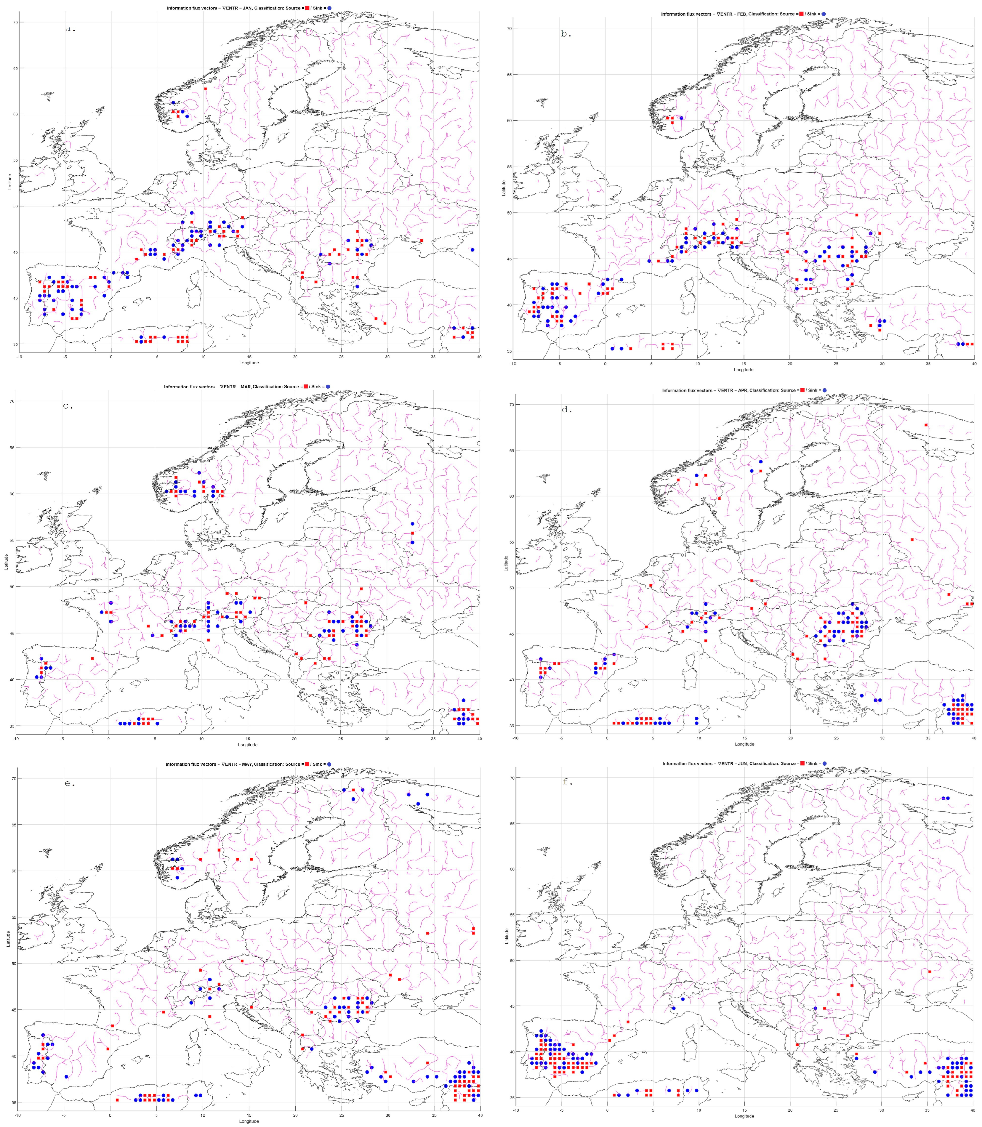 The spatial analysis of the informational entropy field revealed structured variability across Europe at the continental scale. High entropy values clustered over southern and eastern Europe, highlighting areas of elevated disorder and potential atmospheric instability. The entropy field displayed a clear directional structure, indicating paths of fluctuation propagation. Entropy fluxes revealed the dominant spatial pathways of weather information transport, strongly aligned with prevailing circulation trajectories. A predominant west-to-east and south-to-central continental flux was observed, reflecting the combined influence of oceanic air masses and convective activity in southern regions. Local clustering of streamlines points to so-called “information nodes”—regions with high potential for information exchange.