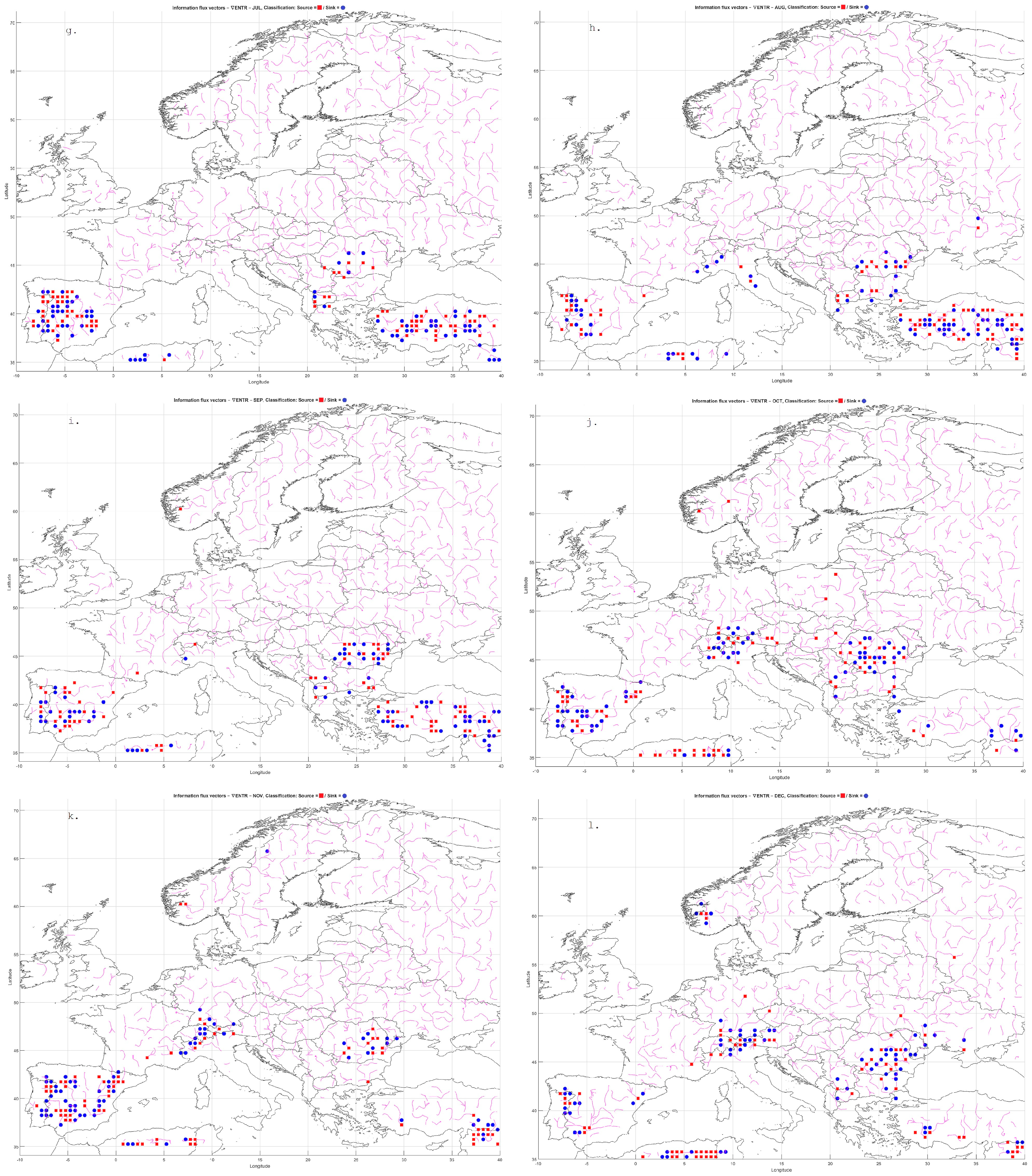 Entropy sources—areas of positive divergence (), where information fluxes diverge radially outward. These are often dynamic convective zones conducive to the generation of intense thunderstorms, convective precipitation, and hailstorms. Notable source regions include the Balkans, the Alps, the Caucasus, and the eastern Mediterranean.