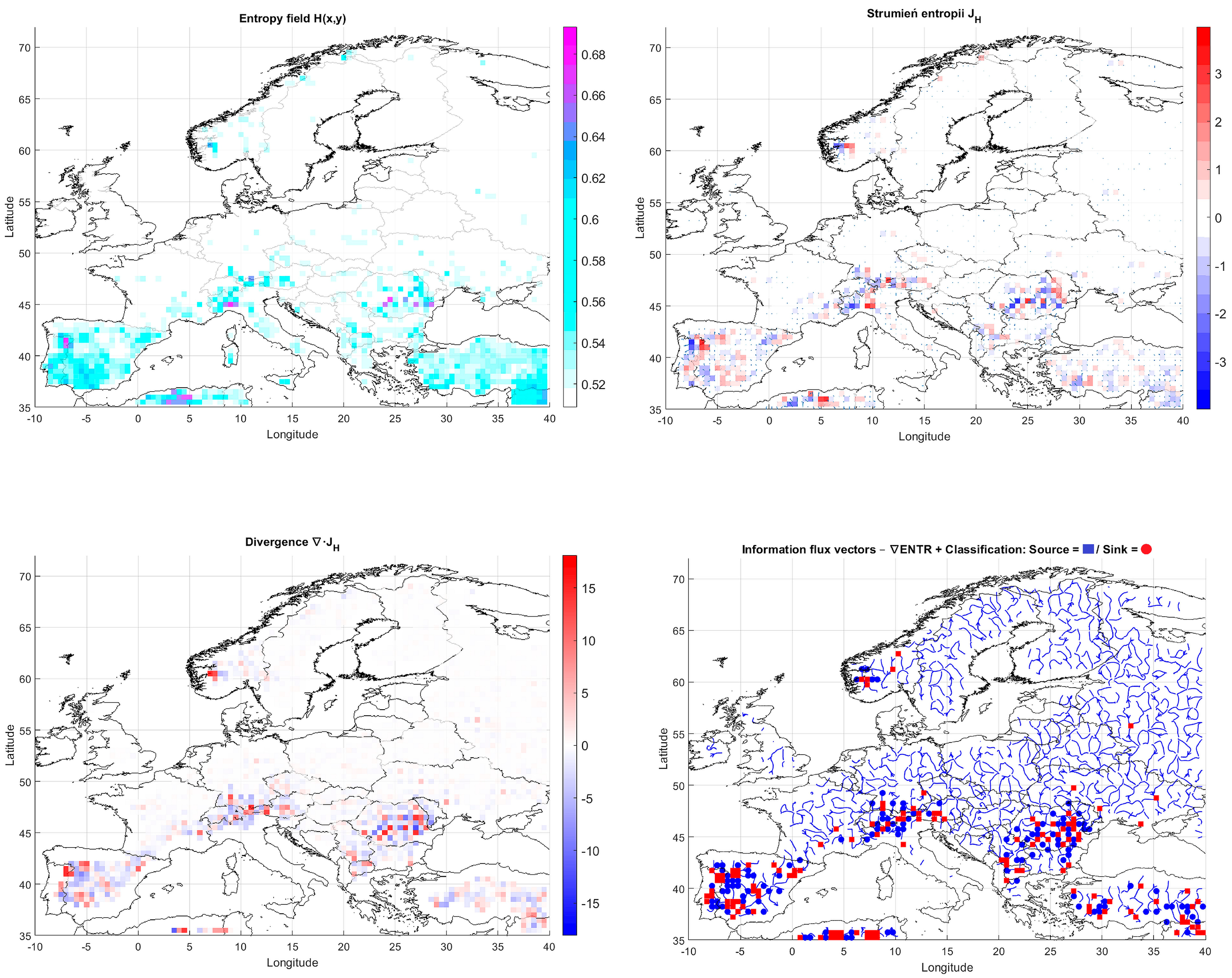 The bottom-left panel depicts the divergence , identifying source regions (positive values) and sink regions (negative values) of entropy. Notably high positive divergence appeared over southern France, Switzerland, and parts of Italy, suggesting these as localized centers of weather variability generation. Conversely, negative divergence values over Hungary and Romania designated these areas as entropy sinks—absorbing external climatic signals.