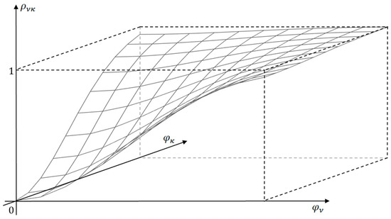 The entropy of the normal distribution consists of two terms: , where is the correlation matrix. The first addend corresponds to the complete independence of the system elements and characterizes the structure of the macrosystem, and the second describes the relationships in the macrosystem. The correlation between fluxes increases, which is observed with the growing magnitude of the exchange driving forces . Figure 2 illustrates the kind of dependency of when components and of the vector are changed. The second term of entropy expression, which is always negative at , ( is the identity matrix), decreases. This explains the statement about as an objective function that reaches its maximum when the macrosystem reaches an equilibrium state, and a state function that sets the direction of processes in a closed system, increasing the dispersion of low-level subsystem parameters while simplifying the macrosystem structure at a high level.