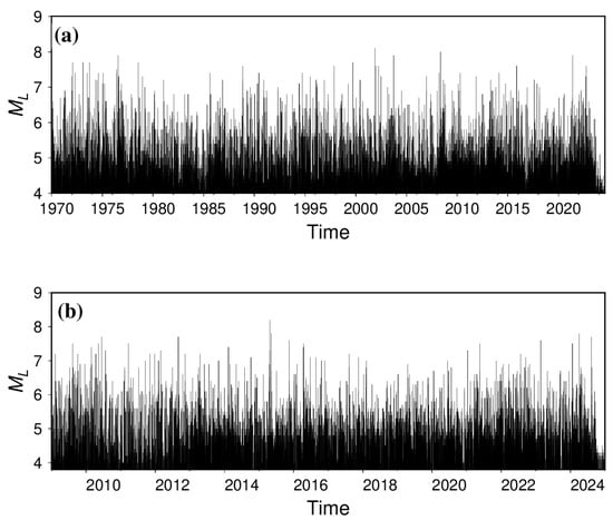 To facilitate qualitative analysis of the magnitude of completeness (), we generated a magnitude-sequence plot for the entire mainland China catalog. Based on the data volume and the approximate levels revealed in this plot, we segmented the earthquake catalog into distinct time periods. Since the 1970s, seismic monitoring capabilities in mainland China have undergone significant enhancement, clearly reflected in the magnitude-sequence plot. The color variations in the plot represent the density of seismic events over time, with brighter bands indicating higher frequencies of seismic activity.