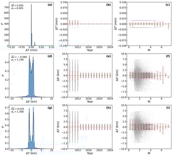 Furthermore, we analyzed whether these parameter differences vary with time or earthquake magnitude (Figure 2). On a macroscopic level, both the mean differences (red dots) and their scatter (error bars) remain broadly stable, exhibiting no clear systematic trends either over time or with increasing magnitude. This result confirms that the statistical characteristics of the errors are fundamentally consistent, providing a sound justification for using a single, fixed set of σ parameters for the subsequent merger of the entire catalog.