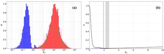 Utilizing the previously optimized standard deviation parameters, we calculated and analyzed the probability density distribution of R0 to evaluate its effectiveness in identifying duplicate events and to determine an optimal classification threshold. Figure 3a contrasts two key distributions. The R0 distribution for cross-catalog nearest-neighbor pairs (blue histogram) exhibits a distinct, concentrated peak at low values (R0 < 1). This peak represents the population of true duplicate events, which are highly correlated in space and time. In stark contrast, the R0 distribution for nearest-neighbor pairs within the CEIC catalog (red histogram) characterizes the random proximity inherent in background seismicity. The clear separation between these two distributions empirically confirms that the R0 metric can effectively distinguish the signal (true duplicates) from the noise (randomly adjacent events).