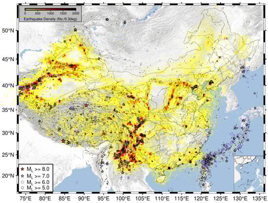 We first generated a spatial density map of seismic activity using the unified 1970–2024 earthquake catalog to provide a macroscopic overview of seismicity patterns across mainland China (Figure 4). The map clearly reveals that seismic activity in China exhibits significant spatial non-uniformity. Earthquakes are highly concentrated in western regions, forming several high-density bands, particularly along the North–South Seismic Belt, within the Tibetan Plateau and its margins, and across the Tianshan seismic belt in Xinjiang. In contrast, seismicity density is markedly lower throughout the vast eastern and northeastern regions. Furthermore, the moderate-to-strong earthquakes indicated on the map occur predominantly within or along the edges of these high-density zones, further corroborating the seismic hazard posed by these tectonically active belts.