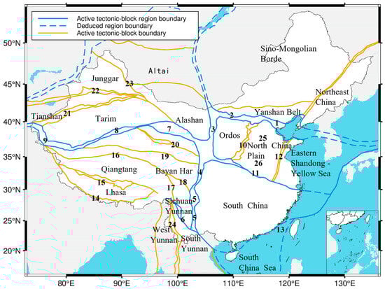 Division of active tectonic blocks and distribution of their boundary zones in mainland China (modified from []). Numbers 1–26 indicate the active block boundary IDs as listed in Table 1 (No. column).
