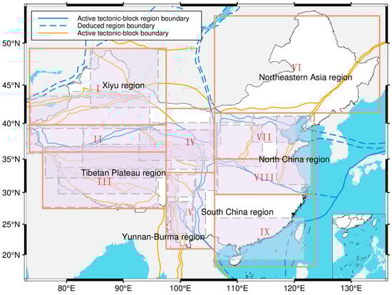Map of regional divisions and active block boundary zones. Orange boxes delineate the final study regions and pink-shaded areas indicate the distribution of active block boundary zones. Roman numerals I–IX correspond to zone IDs in Table 2 (No. column).